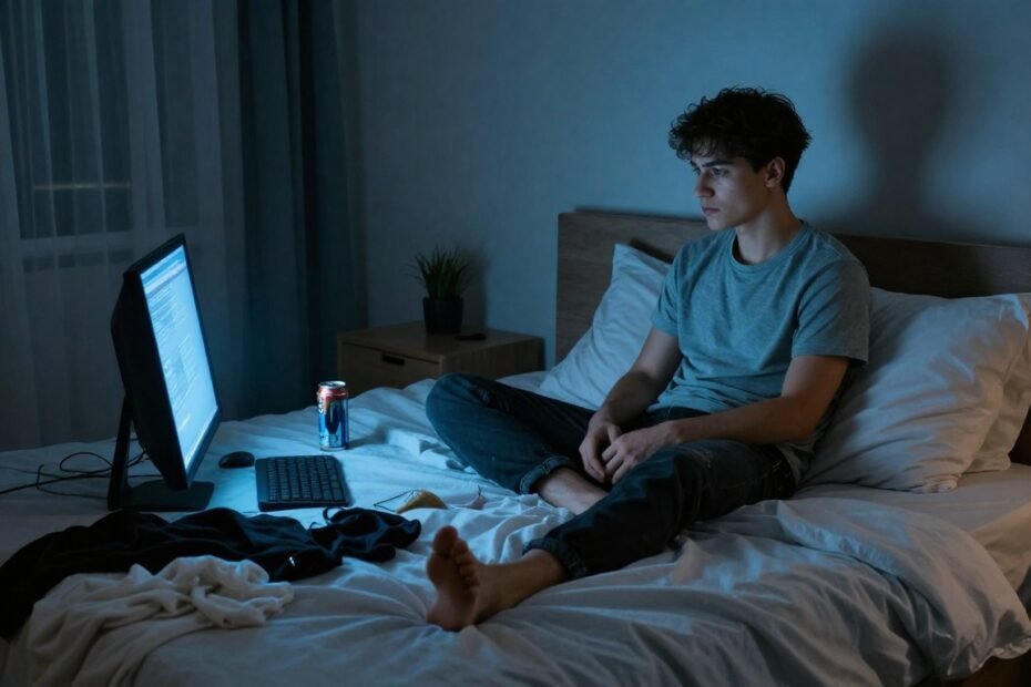 halvnaken dame sitter i et mørkt rom, trist